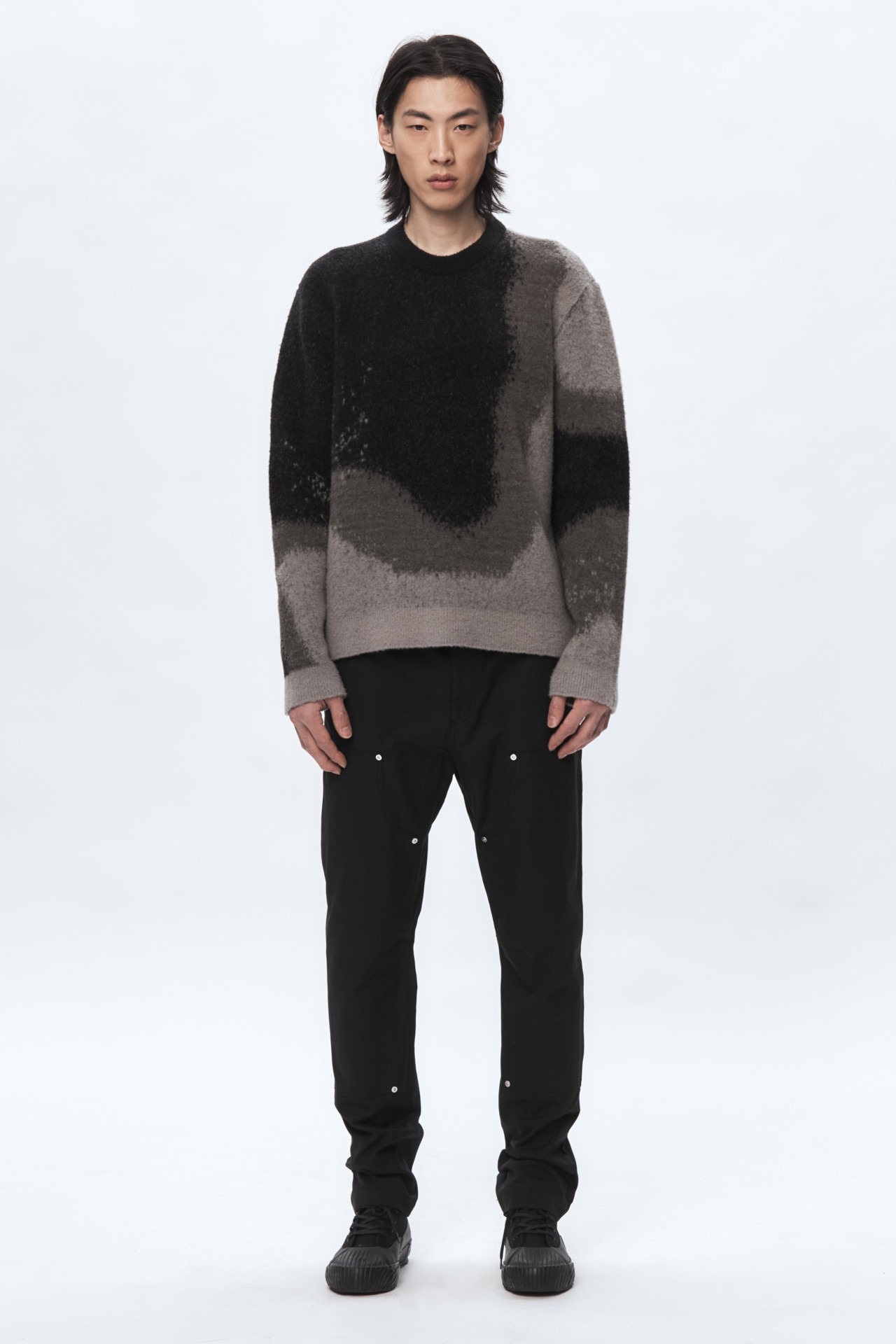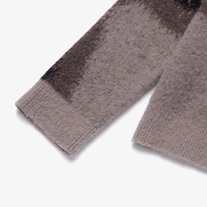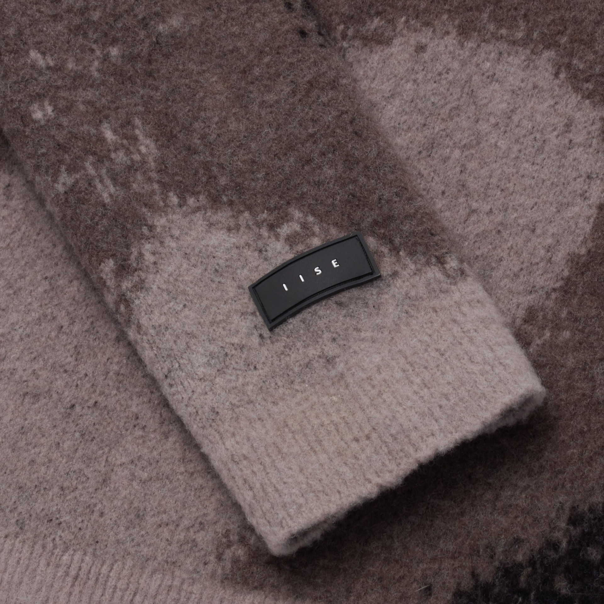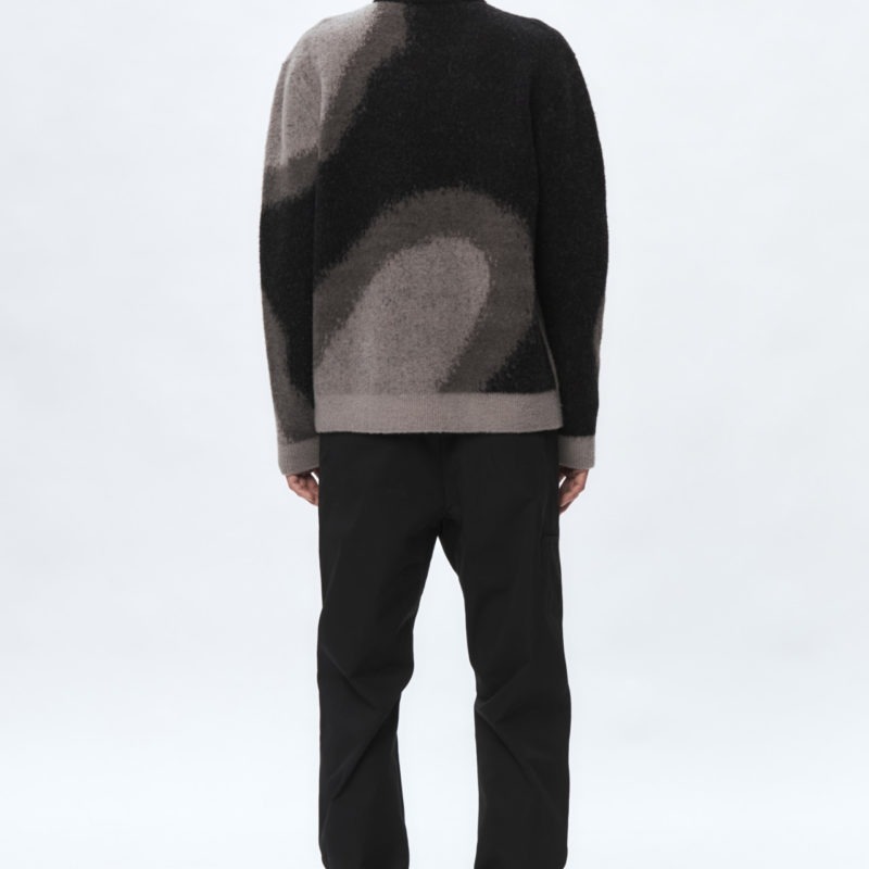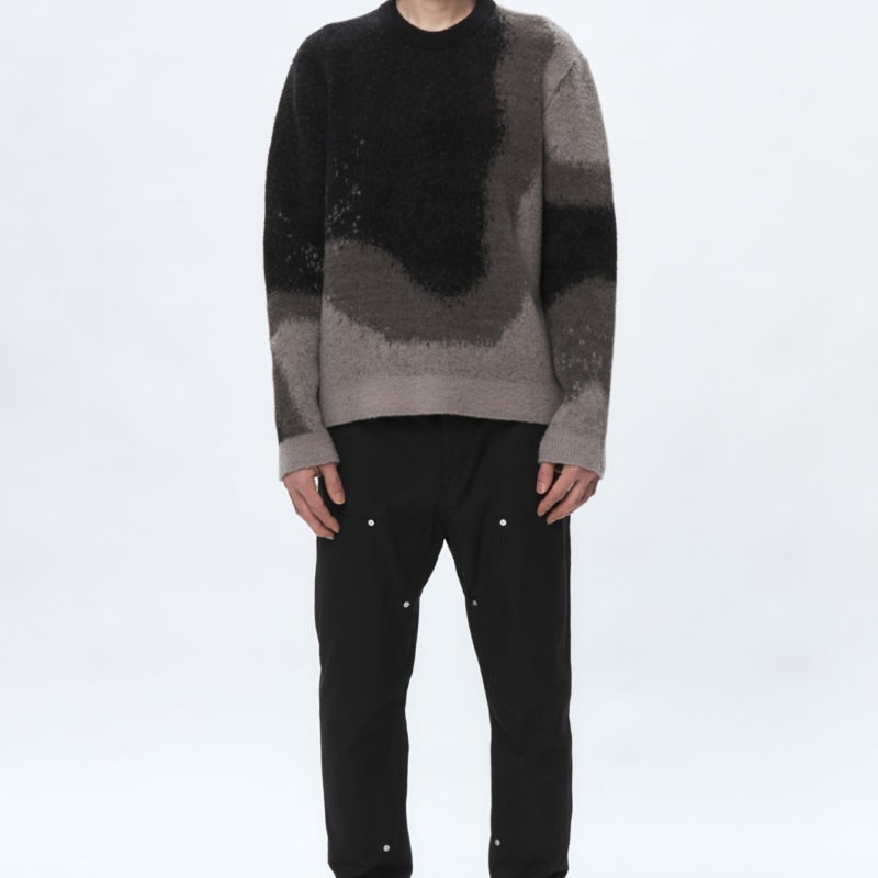 Thick wool blend sweater featuring textures found in Seoul’s industrial district. Brushed wool surface with ribbed cuff and hem. Standard fit with silicon logo patch on sleeve.